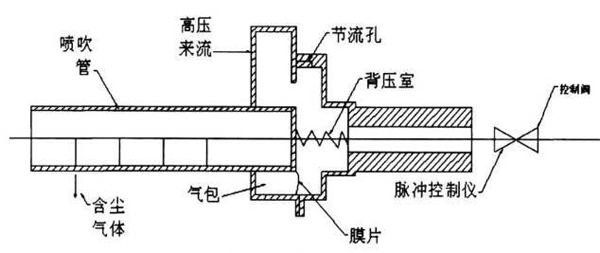 脈沖除塵器噴吹持續的時間短,以雙膜片閥來達到快速的反應時間:分氣包內的壓縮空氣壓迫觸發膜片和主膜片使電磁脈沖閥保持關閉狀態,在電磁閥的激勵下,在觸發膜片上產生壓差,膜片抬起,主膜片一側空氣泄出,主膜片在壓差作用下抬起,分氣包內壓縮空氣進入噴吹管,在噴吹管的引導下沖入濾袋。 在濾袋中快速下沖的壓縮氣流,形成了濾袋相對袋籠的突然徑向變形使濾袋外表面積聚的灰塵脫落。電磁脈沖閥在不激勵狀態時,空氣泄出處關閉,氣壓將膜片復位,電磁脈沖閥關閉。